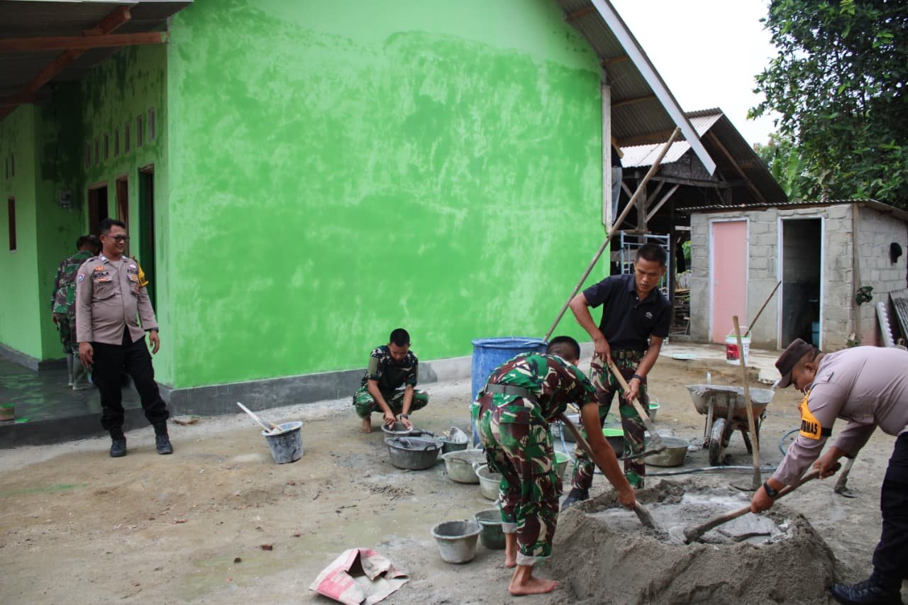 Tahap pengerjaan kali ini difokuskan pada pengecatan kusen dan plester dinding belakang rumah. Satgas TMMD bersama warga bahu-membahu menyelesaikan pekerjaan dengan semangat gotong royong, demi menghadirkan hunian layak bagi warga penerima manfaat.