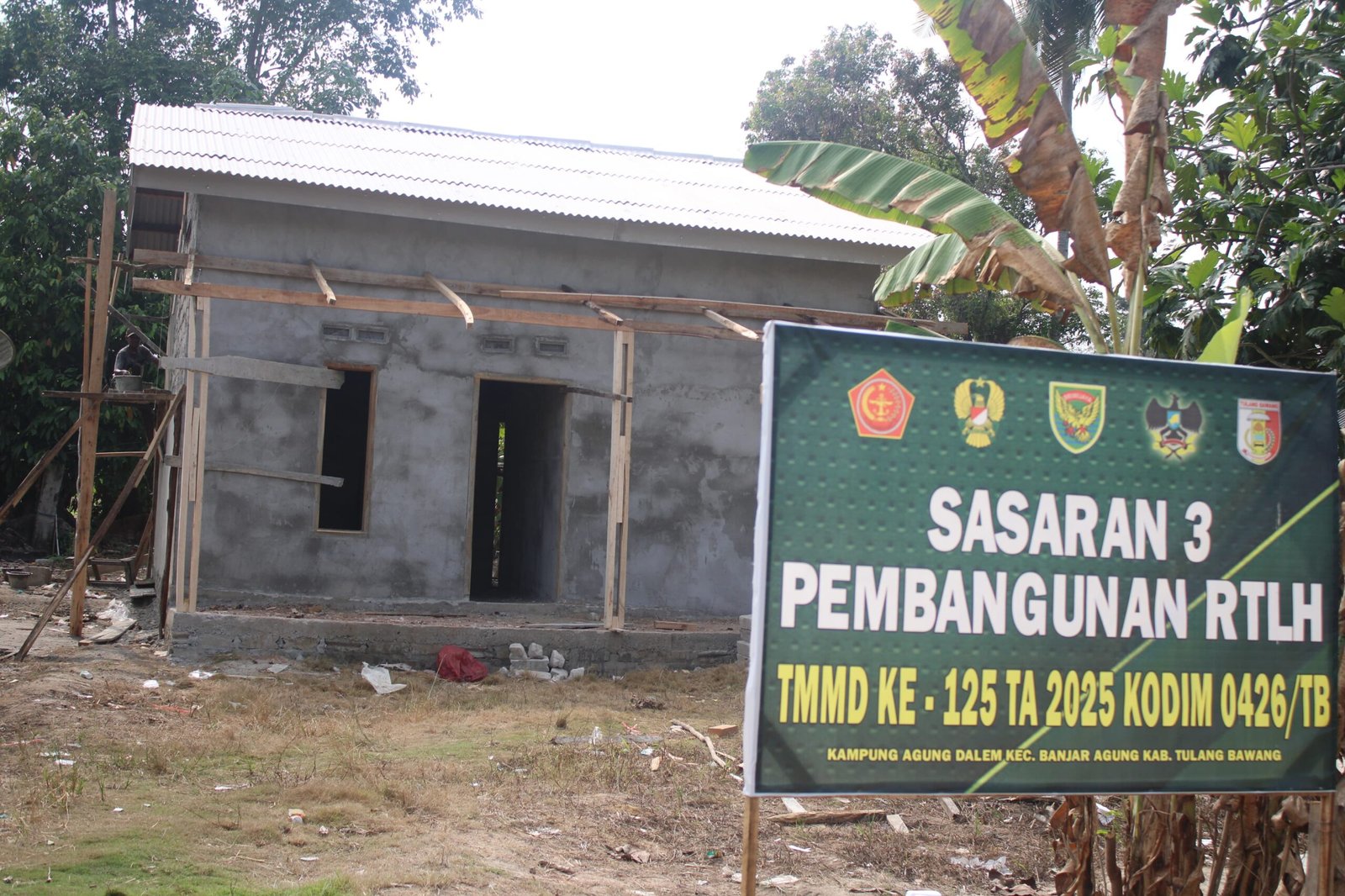Tulang Bawang – Pembangunan Rumah Tidak Layak Huni (RTLH) di Kampung Agung Dalam, Kecamatan Banjar Agung, Kabupaten Tulang Bawang, yang menjadi salah satu sasaran fisik TNI Manunggal Membangun Desa (TMMD) ke-125 Kodim 0426/Tulang Bawang, kini telah memasuki tahap plester dinding. Pengerjaan tersebut dilakukan pada Minggu (10/08/2025).