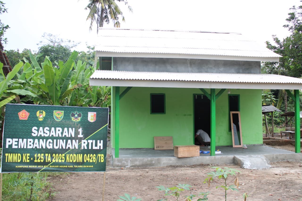 Tulang Bawang – Program TNI Manunggal Membangun Desa (TMMD) ke-125 di Kampung Moris Jaya, Kecamatan Banjar Agung, Kabupaten Tulang Bawang, terus berlanjut dengan fokus pada sasaran perbaikan Rumah Tidak Layak Huni (RTLH). Kamis (14/8/2025), Satgas TMMD bersama warga melaksanakan pemasangan pintu pada RTLH sasaran 1 yang kini telah memasuki tahap penyelesaian.
