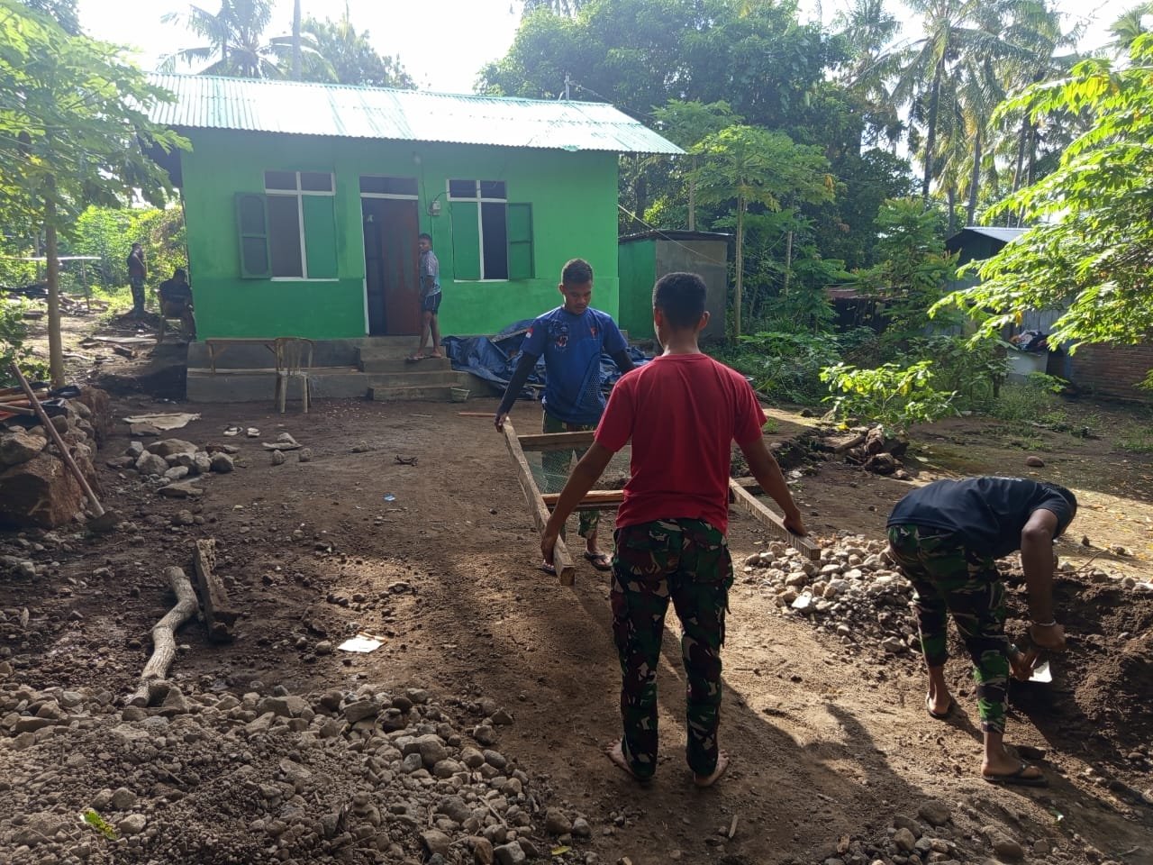 Flotim — Semangat personel Satgas TMMD ke-124 Kodim 1624/Flotim terus menyala jelang berakhirnya program. Salah satu hasil nyata yang hampir rampung adalah rehabilitasi Rumah Tidak Layak Huni (RTLH) milik Bapak Florianus, warga Kelurahan Sarotari, Kecamatan Larantuka, Kabupaten Flores Timur. Minggu (01/06/2025), progres pembangunan telah mencapai tahap akhir.