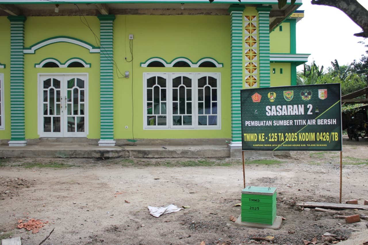 Tulang Bawang, 13 Agustus 2025 – Program TNI Manunggal Membangun Desa (TMMD) ke-125 Kodim 0426/Tulang Bawang kembali menorehkan capaian penting. Pekerjaan pada sasaran 2, berupa pembangunan sumber titik air bersih di Kampung Moris Jaya, Kecamatan Banjar Agung, resmi rampung 100 persen pada Rabu (13/8/2025).