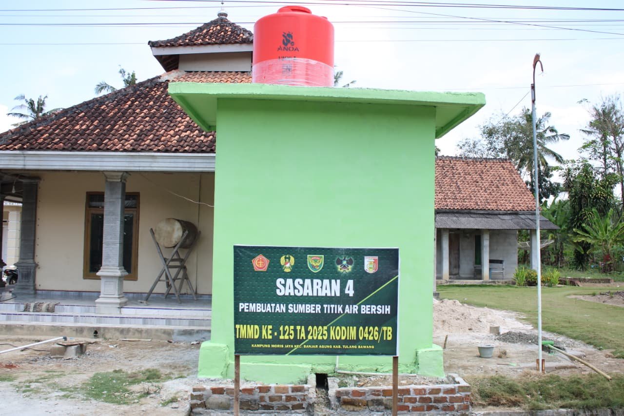 Tulang Bawang – Program TNI Manunggal Membangun Desa (TMMD) ke-125 Kodim 0426/Tulang Bawang kembali menorehkan capaian penting. Pekerjaan sasaran 4 berupa pembangunan sumber air bersih di Kampung Moris Jaya, Kecamatan Banjar Agung, kini resmi rampung 100 persen pada Sabtu (16/8/2025).