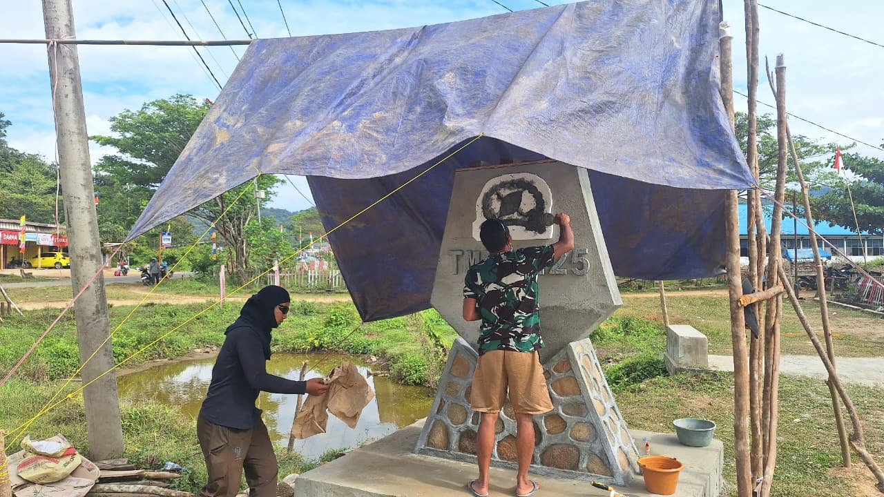 Konawe – Semangat Satgas TMMD ke-125 Kodim 1417/Kendari patut diapresiasi. Di tengah hujan yang mengguyur Desa Awua Jaya, Kecamatan Asinua, Minggu (17/8), mereka tetap melanjutkan pembangunan tugu TMMD dengan memanfaatkan terpal sebagai pelindung.