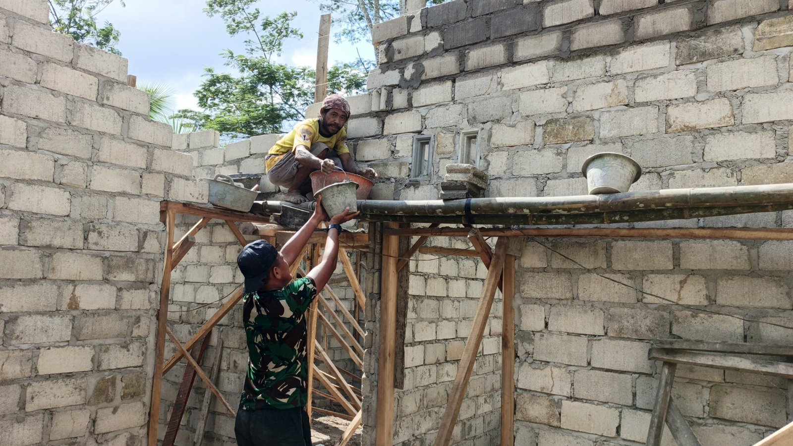 “Kalau bagian dalamnya sudah selesai, nanti kita lanjut ke plester dan atap. Ini tanda rumah sudah semakin mendekati penyelesaian,” kata salah satu anggota Satgas yang turut mengerjakan di lokasi.
