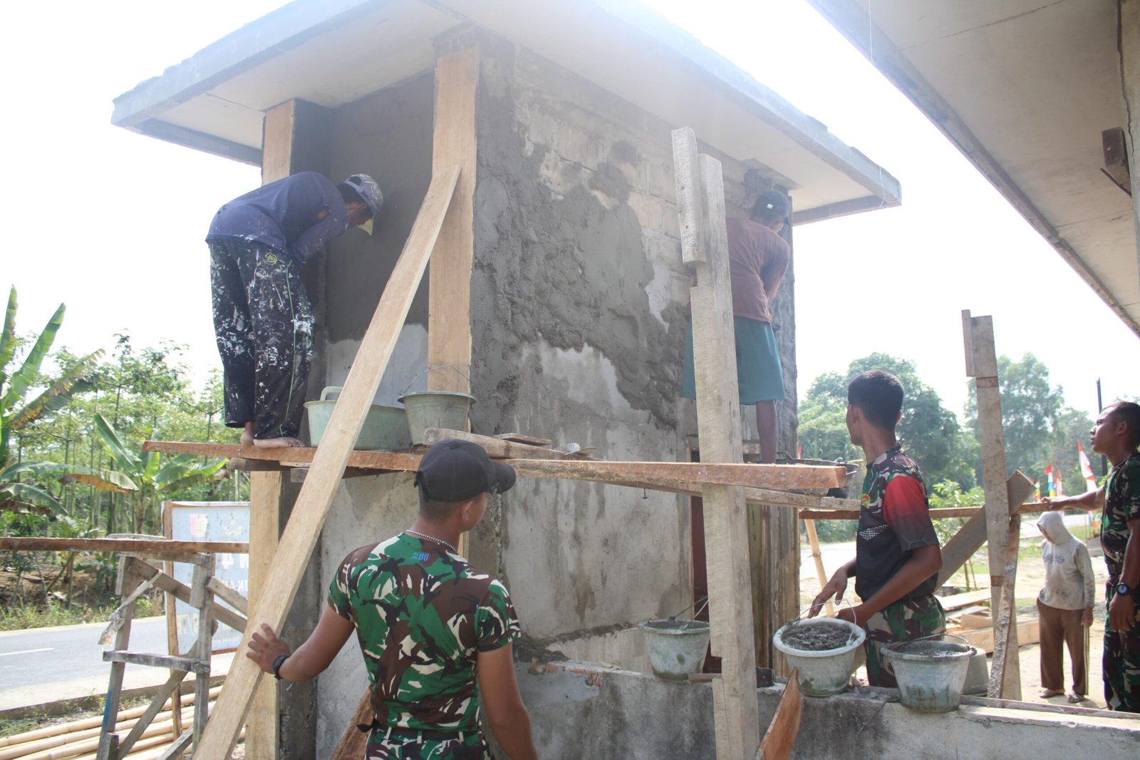 Plester dinding dilakukan untuk memperkuat struktur bangunan sekaligus memperhalus permukaan sebelum tahap acian dan pengecatan. Dengan adonan semen dan pasir yang proporsional, Satgas bekerja teliti agar hasilnya kokoh dan rapi.