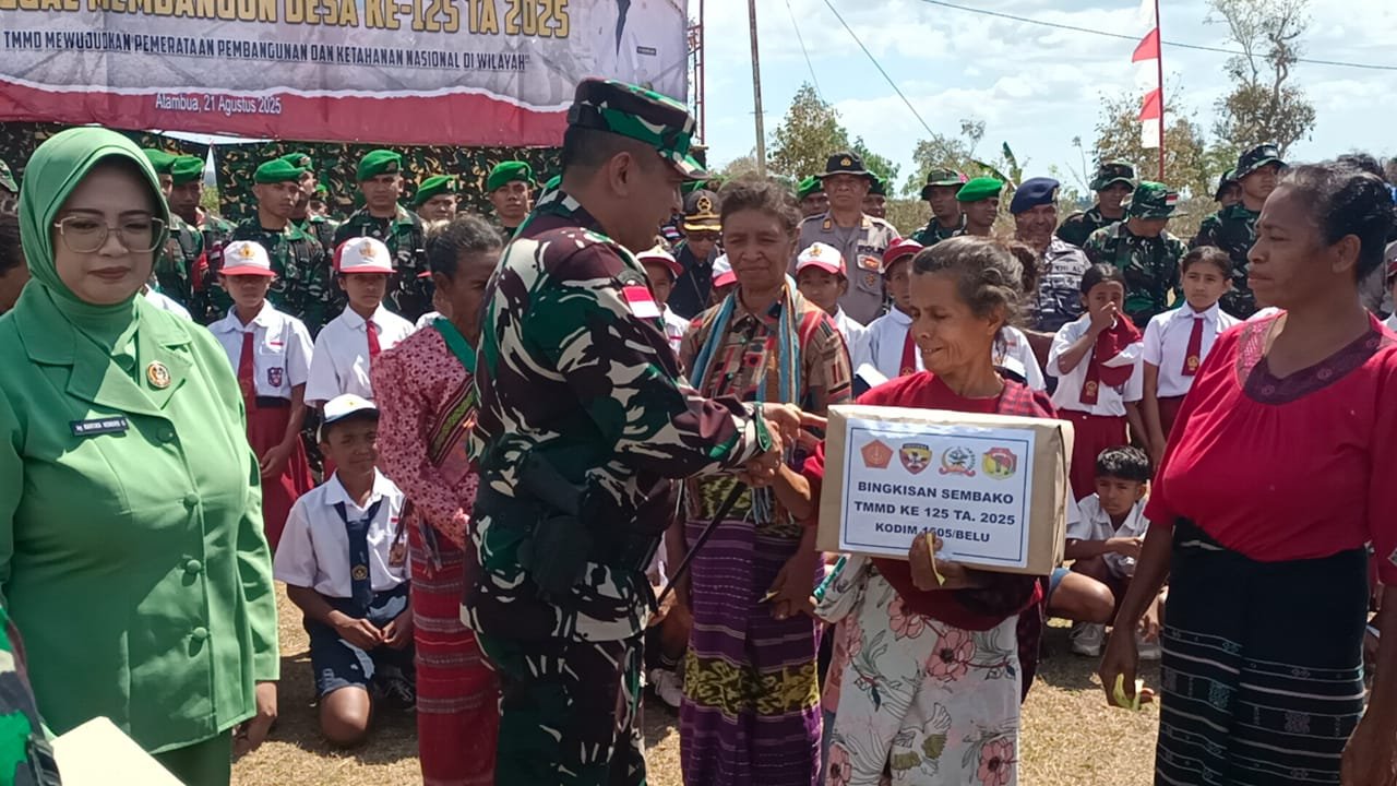 Belu – Penutupan program TNI Manunggal Membangun Desa (TMMD) ke-125 Kodim 1605/Belu di Lapangan Desa Naekasa, Kecamatan Tasifeto Barat, Kamis (21/8/2025), turut diwarnai dengan pembagian sejumlah paket sembako kepada masyarakat.