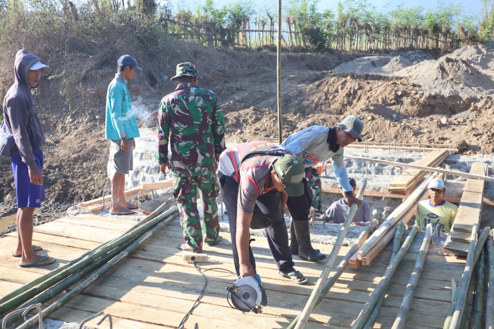 Rangka besi beton merupakan tulang utama kekuatan jembatan. Pemasangannya memerlukan ketepatan ukuran dan kekuatan ikatan agar mampu menahan beban lalu lintas serta kondisi cuaca dalam jangka panjang. Di lokasi, terlihat prajurit dan warga saling bahu-membahu memotong besi, mengikat kawat, dan menata rangka sesuai gambar rencana.