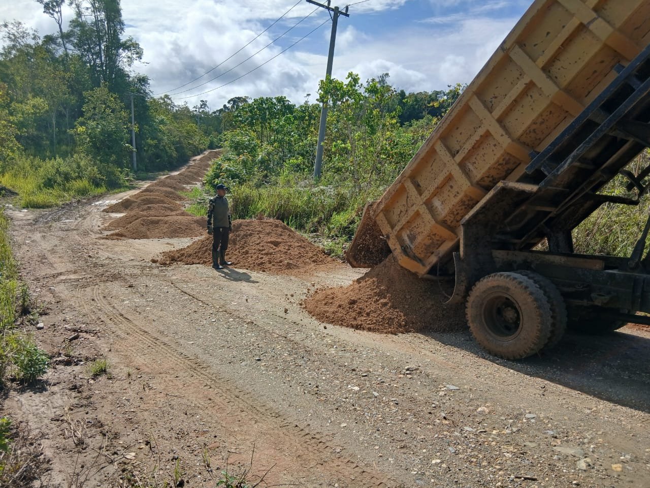 Para personel TMMD bersama warga tampak kompak menurunkan dan meratakan material yang diangkut dari lokasi tambang terdekat. Semangat gotong royong terpancar dari kebersamaan mereka di bawah terik matahari.