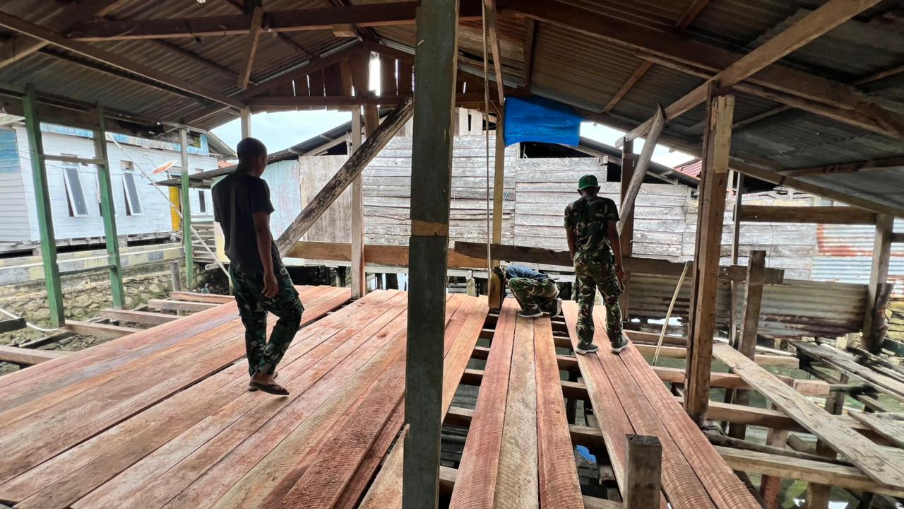 Dengan penuh perhatian dan keahlian, para prajurit mengerjakan pemasangan papan lantai dengan sangat presisi, bertujuan agar hasilnya menjadi kokoh dan nyaman digunakan dalam jangka panjang. Proses pengerjaan ini dilakukan secara kolaboratif dengan melibatkan warga setempat, menciptakan semangat kebersamaan dalam pembangunan.