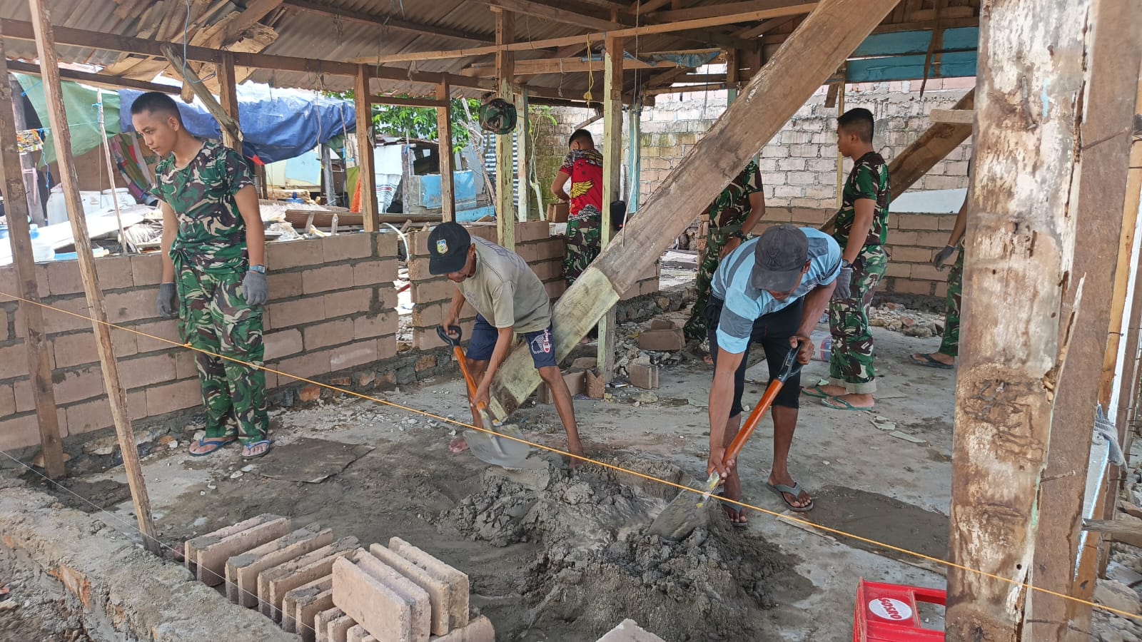 Di titik sasaran ketiga, anggota TNI terlihat bekerja sama dengan masyarakat setempat dalam proses pendirian dinding rumah. Para prajurit dan warga saling bahu-membahu, menyusun material bangunan secara bertahap dengan perhatian yang tinggi terhadap ketelitian, guna memastikan bahwa struktur yang dihasilkan kuat dan aman.