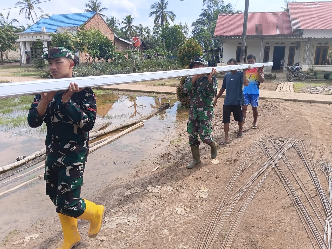 Nampak antusiasme dari warga sekitar yang turut membantu dalam pengangkutan material. Sinergi antara TNI dan masyarakat sangat terasa dalam setiap langkah pengerjaan, mencerminkan semangat kemanunggalan yang kokoh.