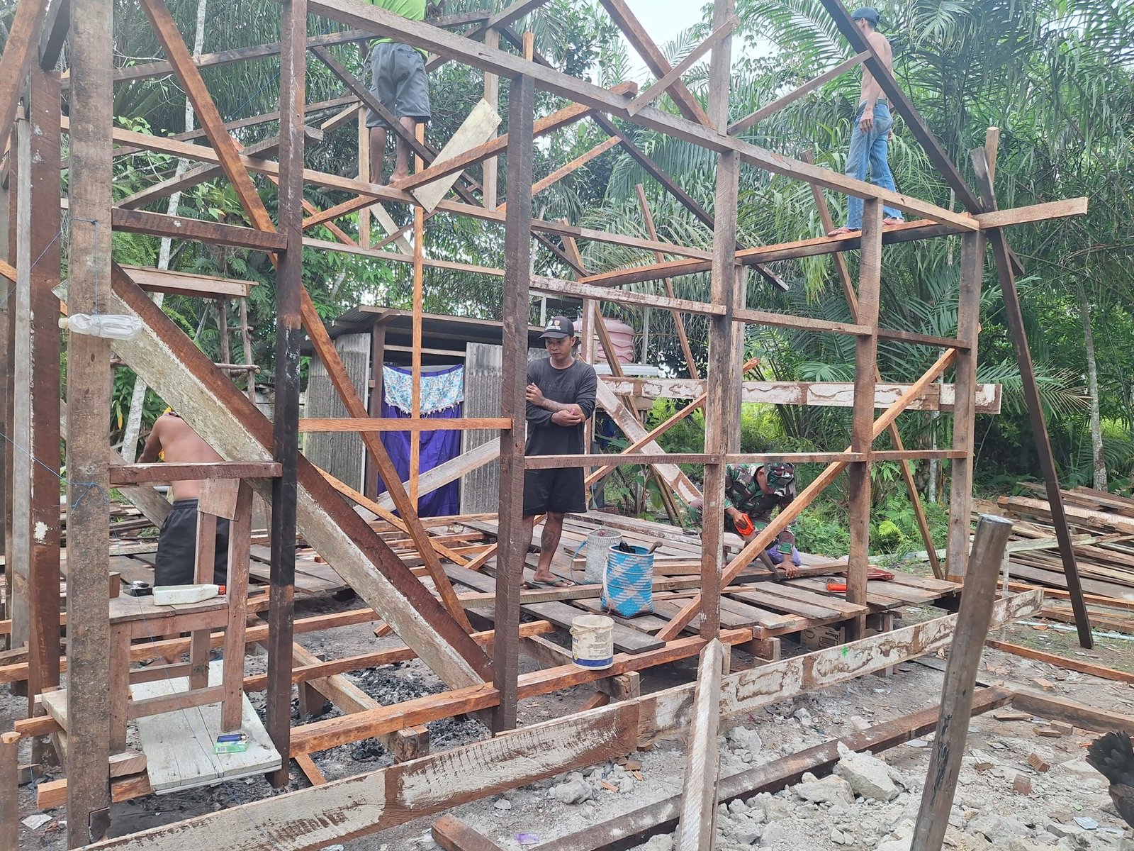 Pengerjaan rumah ini merupakan bagian dari program fisik TMMD yang bertujuan memberikan solusi nyata atas keterbatasan tempat tinggal masyarakat kurang mampu. Dengan tiang-tiang rumah yang sudah berdiri, struktur dasar bangunan mulai terbentuk secara nyata.