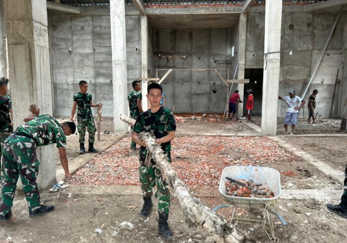 Tampak Satgas TMMD Kodim 1628 bersama masyarakat bergotong royong mengerjakan rehab mesjid untuk kenyamanan bersama saat melaksanakan ibadah.