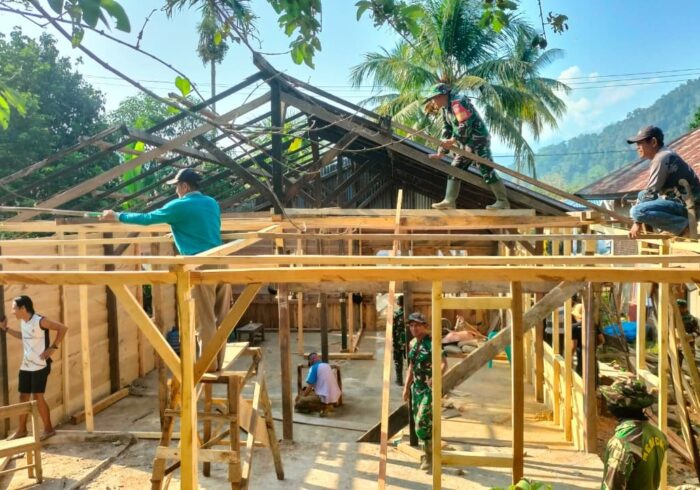 Seperti yang di lakukan Praka Zulfajri Ia membantu Ibu Sukemih sekaligus orang tua asuh menyiapkan memasak makan pagi dan siang sebelum berangkat ke lokasi pengerjaan kegiatan TMMD.