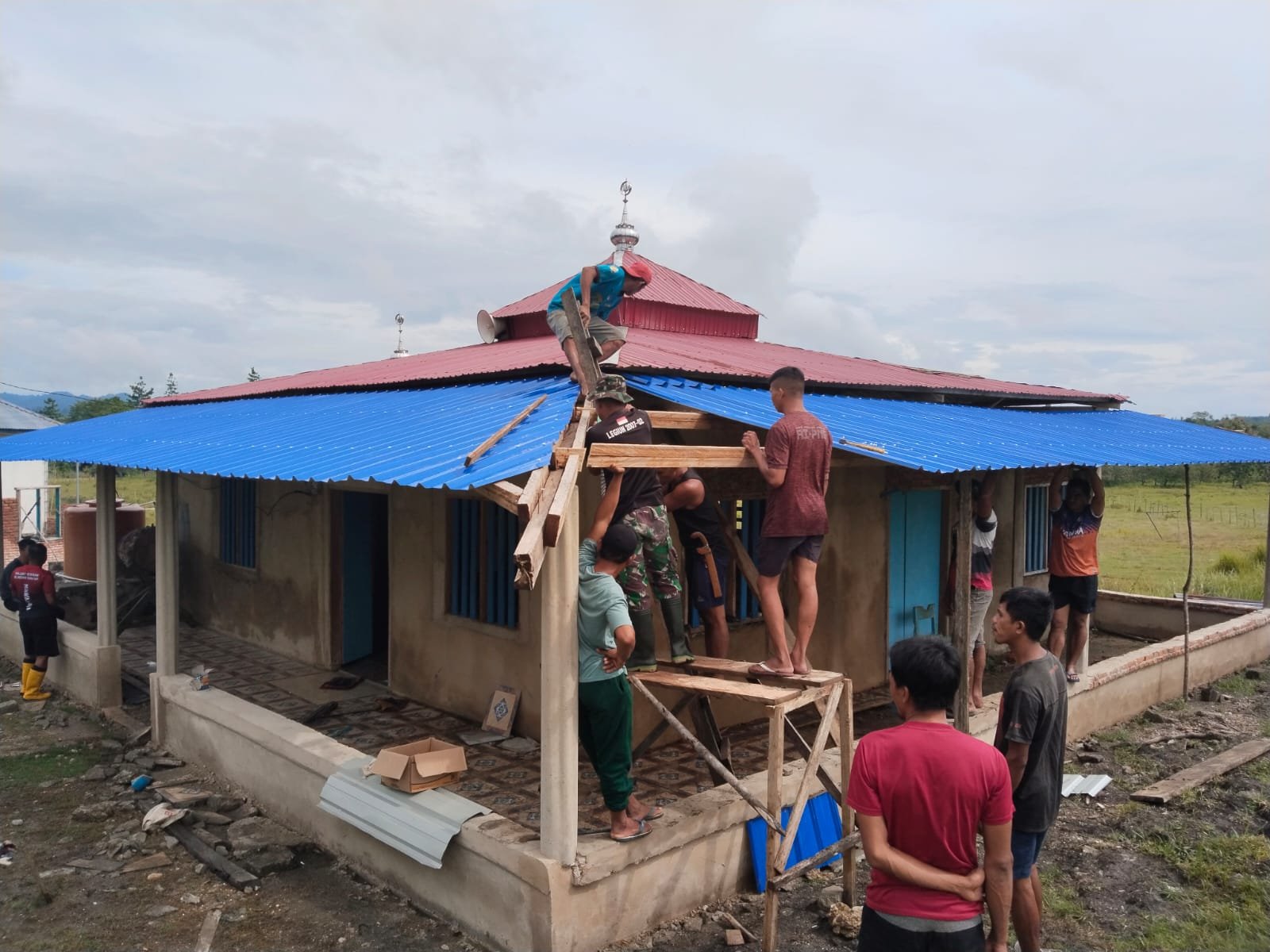Satgas TMMD ke-124, Dibantu Warga Tuntaskan Pemasangan Atap Teras Masjid Al-Mukmin Desa Totole.
