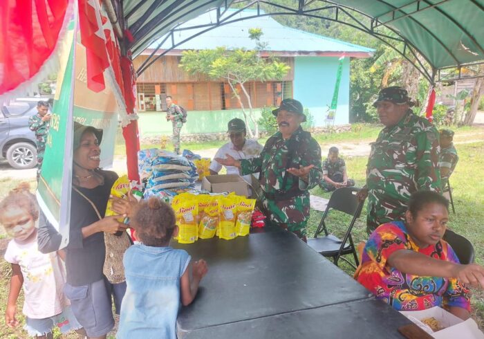 Terlihat para personel TNI bersama masyarakat setempat bekerja bersama di lapangan, menunjukkan semangat gotong royong yang menjadi ciri khas pelaksanaan TMMD.