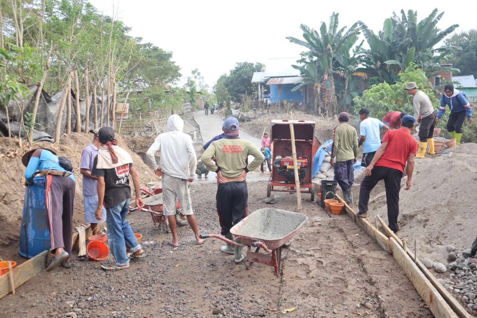 Pelaksanaan kegiatan dilakukan secara gotong royong. Personel TNI bersama warga saling bahu-membahu mengangkut material hingga menuangkan cor di lokasi. Suasana kebersamaan dan semangat kerja sama menjadi pemandangan yang mencerminkan eratnya kemanunggalan TNI dengan rakyat.