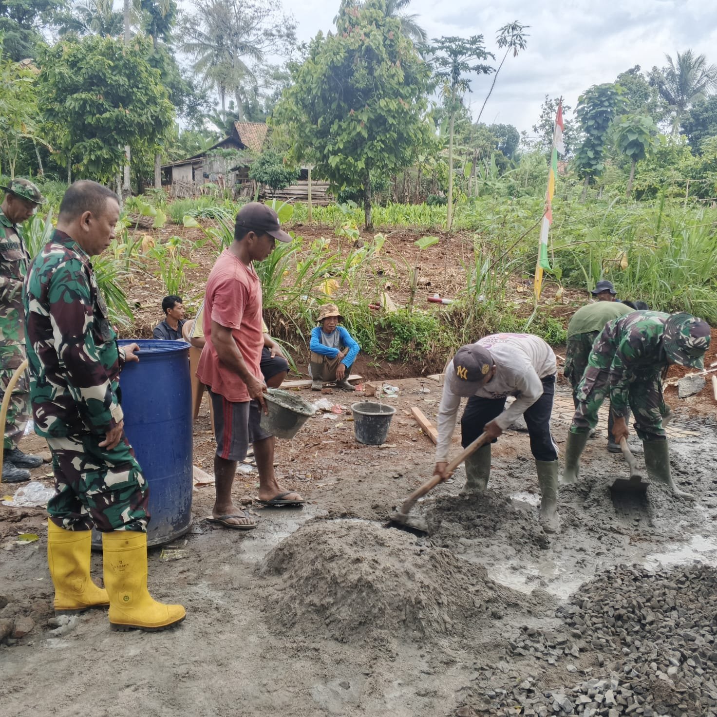 Dalam kegiatan tersebut tampak personel Satgas TMMD bekerja bahu membahu bersama warga melakukan pengecoran dasar dan pemasangan rangka besi gorong-gorong. Suasana penuh semangat dan kebersamaan terlihat di lokasi kerja, mencerminkan semangat gotong royong antara TNI dan masyarakat.