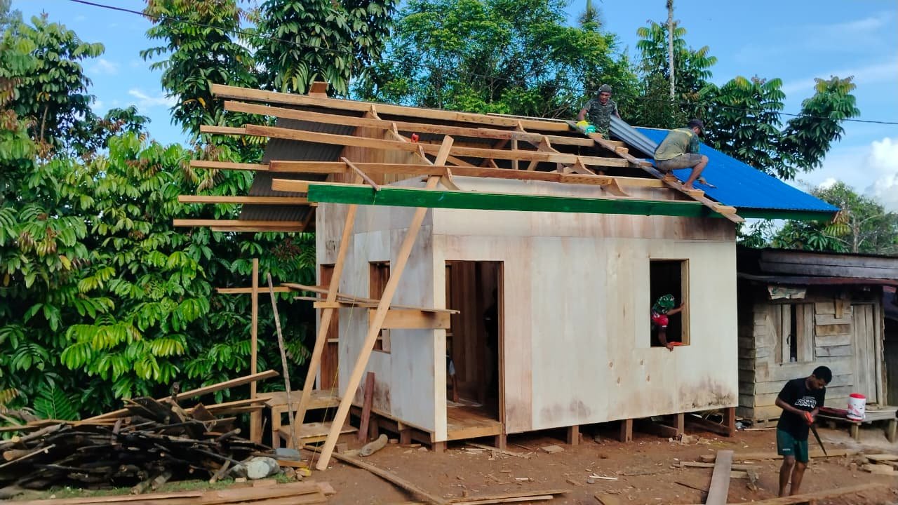Boven Digoel – Pembangunan Rumah Tidak Layak Huni (RTLH) oleh Satuan Tugas (Satgas) TNI Manunggal Membangun Desa (TMMD) ke-126 Kodim 1711/Boven Digoel menunjukkan perkembangan yang menggembirakan. Personel Satgas bersama masyarakat Kampung Waropko terus bekerja keras agar seluruh sasaran RTLH dapat rampung tepat waktu.