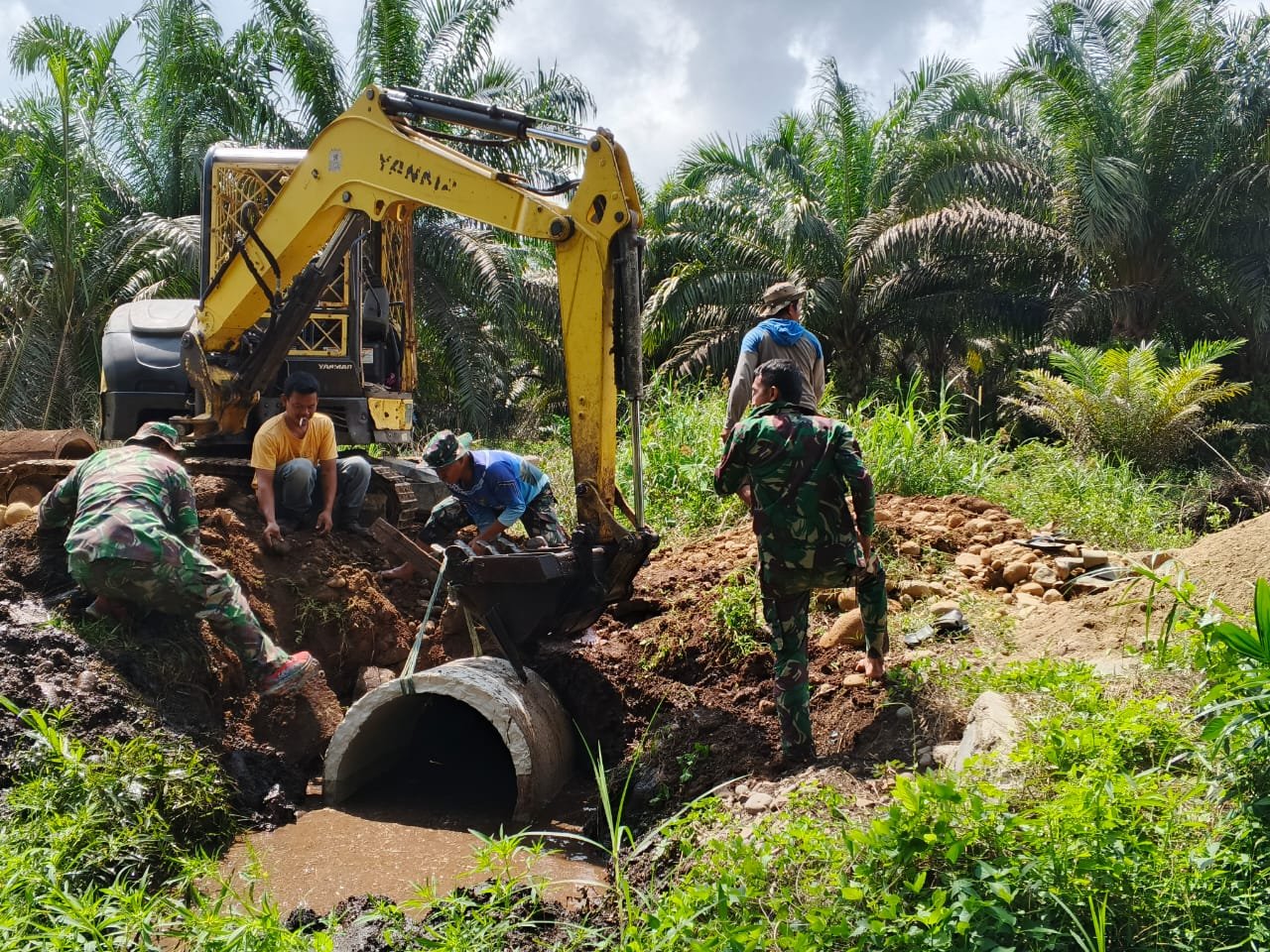 Meski menggunakan bantuan alat berat, proses pemasangan gorong-gorong tidak bisa dilakukan sembarangan. Satgas TMMD bersama operator excavator tampak bekerja sama dengan penuh kecermatan, memastikan gorong-gorong masuk ke lubang galian dengan presisi.