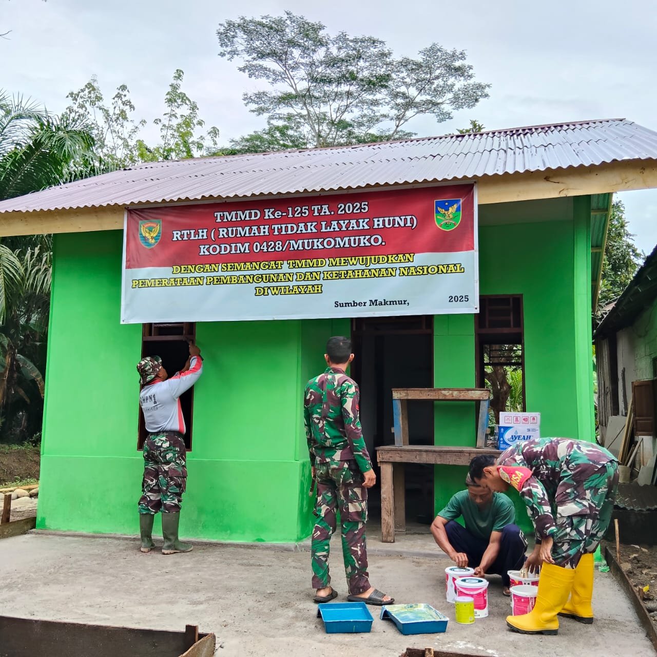 Anggota Satgas TMMD Ke-125 Kodim 0428/Mukomuko melaksanakan proses pengecatan rumah warga penerima bantuan Rumah Tidak Layak Huni (RTLH) di Desa Sumber Makmur, Kecamatan Lubuk Pinang, Minggu (03/08/2025). Pengecatan ini merupakan tahap akhir dari proses renovasi rumah yang telah dikerjakan sejak hari-hari awal pelaksanaan TMMD.