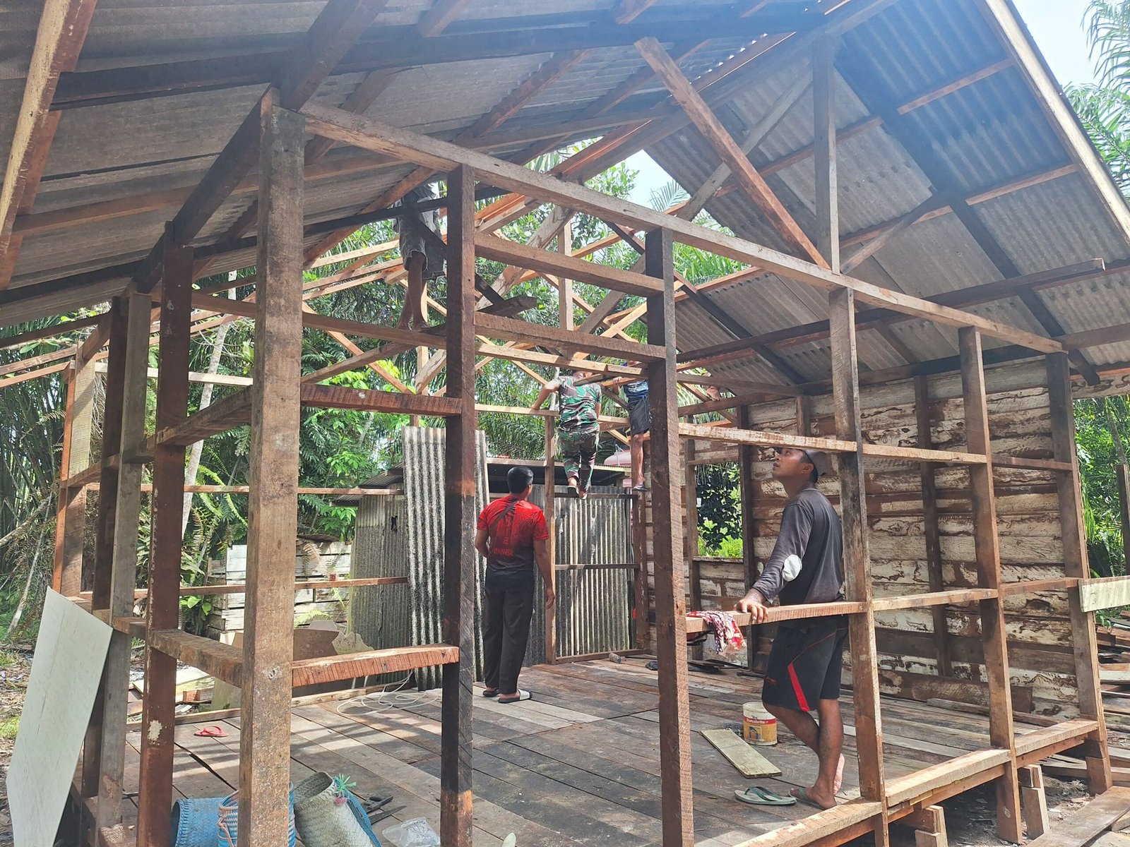 Proses pemasangan atap dilakukan secara gotong royong oleh anggota Satgas TMMD bersama warga desa. Tahapan ini merupakan langkah krusial dalam memastikan struktur rumah yang kokoh dan aman bagi penghuni. Dengan semangat kebersamaan dan kepedulian, pekerjaan berlangsung lancar dan penuh kehati-hatian.