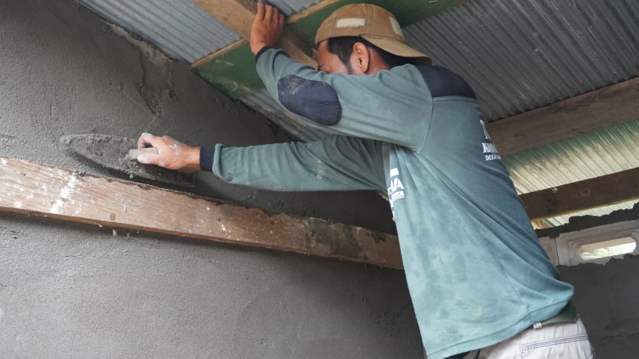 Sejak pagi, prajurit TNI beserta warga terlihat bekerja sama dalam mengaduk semen dan meratakan plester pada dinding bangunan. Proses ini merupakan bagian krusial dalam penyempurnaan konstruksi sebelum masuk ke tahap finishing.