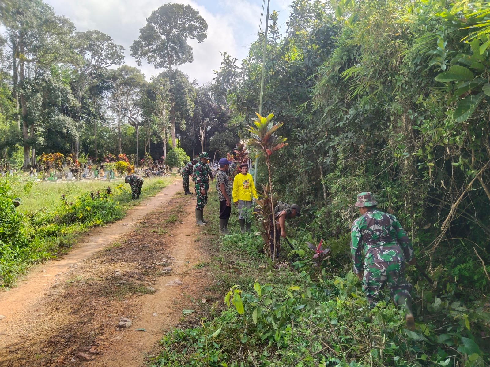 Puluhan personel Satgas bersama warga turun langsung membersihkan semak belukar, rumput liar, dan sampah yang menumpuk di sekitar kompleks pemakaman. Kegiatan ini bertujuan menciptakan lingkungan yang bersih, sehat, serta memberikan kenyamanan bagi masyarakat yang hendak berziarah.