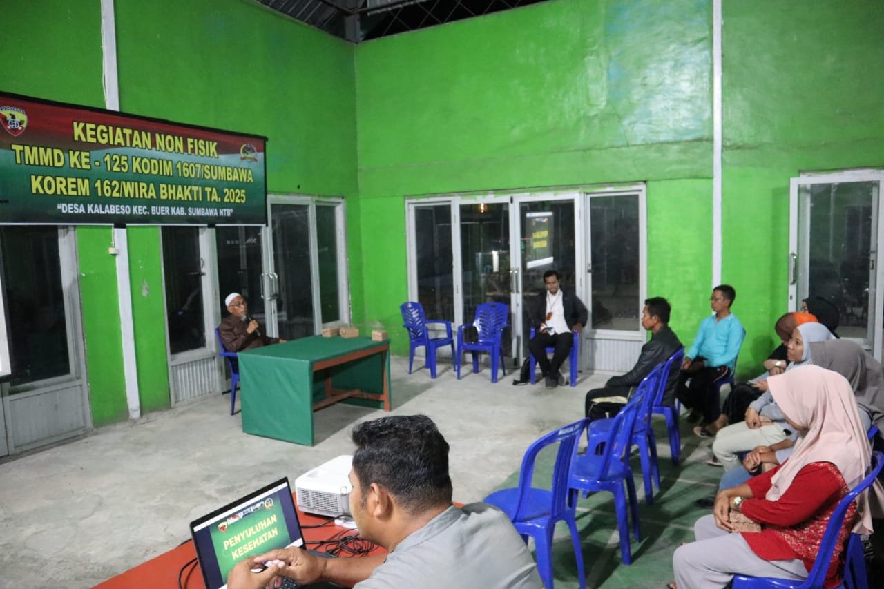 NTB – Sumbawa, Dalam rangka meningkatkan kesadaran masyarakat tentang pentingnya kesehatan, Satgas TNI Manunggal Membangun Desa (TMMD) ke-125 mengadakan kegiatan penyuluhan kesehatan di aula Desa Kalabeso, Kecamatan Buer, Kabupaten Sumbawa, Rabu malam (6/8/2025).