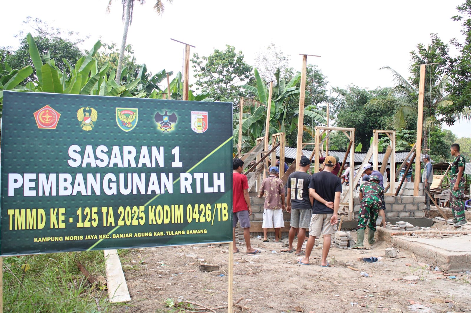 Kegiatan fisik TMMD ke-125 Kodim 0426/Tulang Bawang terus berlanjut dengan progres signifikan pada sasaran 1 pembangunan Rumah Tidak Layak Huni (RTLH) di Kampung Moris Jaya, Kecamatan Banjar Agung. Rabu (30/07/2025), Satgas TMMD melanjutkan proses pemasangan bata sebagai dinding rumah.
