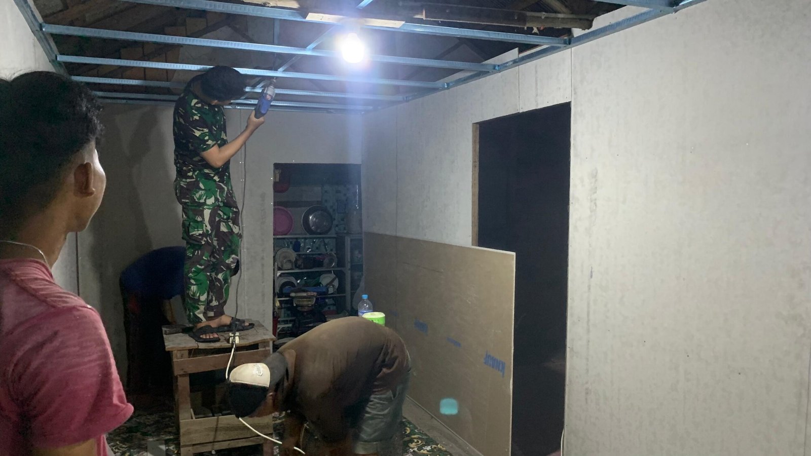 Meski hari mulai gelap, prajurit TNI tetap semangat bekerja lembur memanfaatkan lampu portable agar proses pengecatan dan perbaikan rumah tetap berjalan lancar tanpa hambatan. Kebersamaan antara Satgas dan warga semakin terlihat dalam suasana kerja malam hari.
