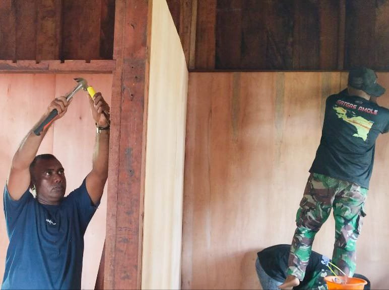 Timika – Program TNI Manunggal Membangun Desa (TMMD) ke-124 di Kampung Pigapu memasuki tahap penting. Hari ini, Satgas TMMD bersama warga setempat mulai melakukan pemasangan dinding kamar pada bangunan rumah milik Ibu Sisilia. Kamis (22/5/2025)