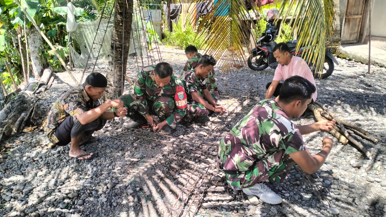 Salah satu anggota Satgas TMMD menjelaskan bahwa proses pengikatan besi dilakukan dengan penuh ketelitian karena akan menjadi struktur utama penopang bangunan.