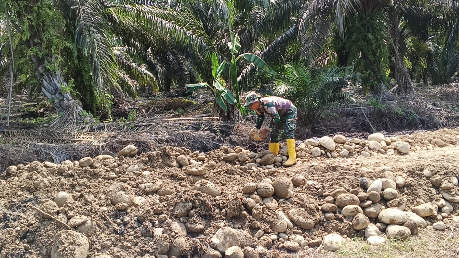 Proses ini dilakukan dengan gotong royong. Satgas menggunakan linggis dan peralatan lain untuk membantu mengangkat dan memindahkan batu-batu berat ke pinggir. Meski pekerjaan cukup melelahkan, mereka tetap semangat demi memperlancar pembangunan.