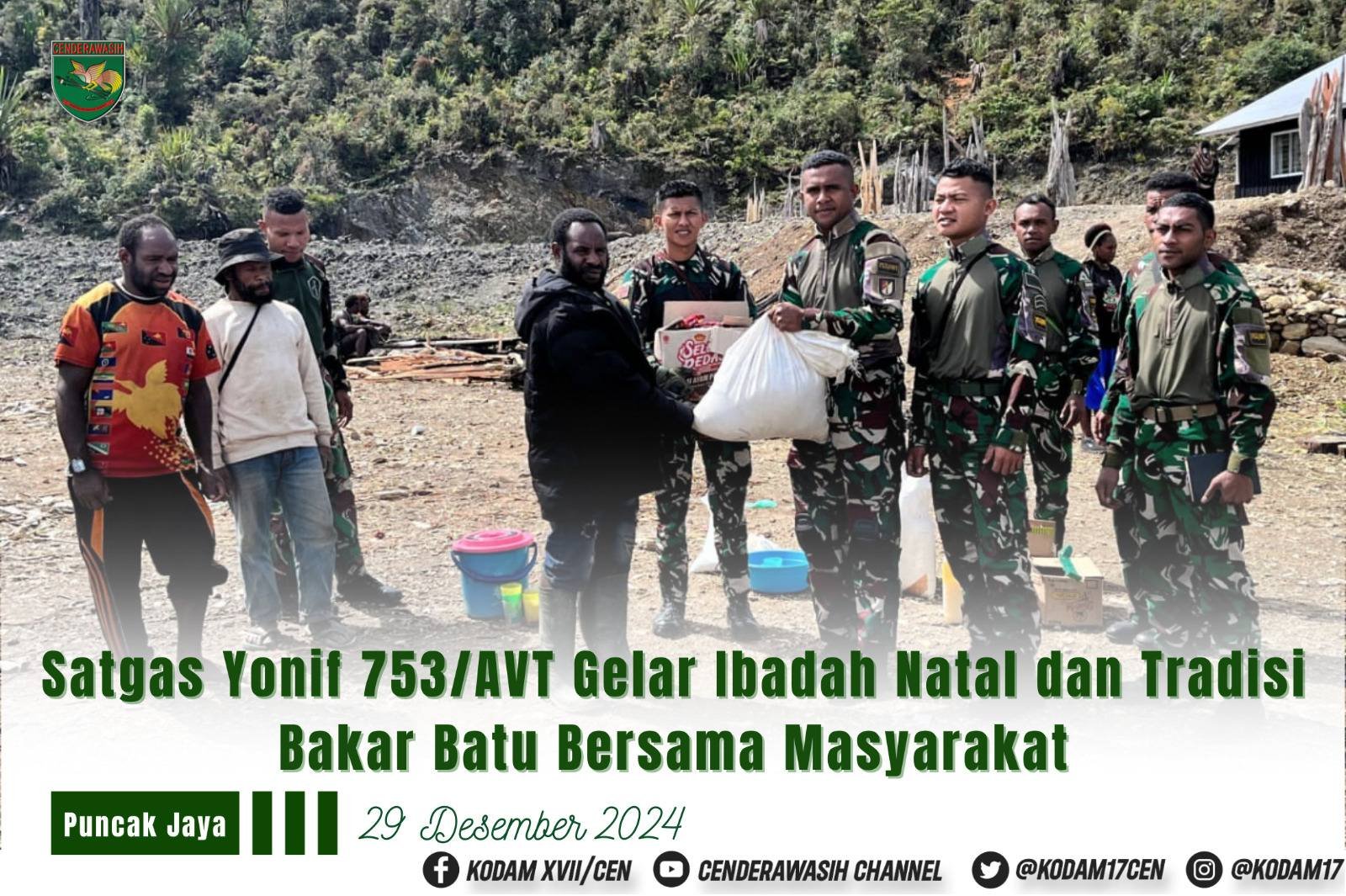 Kegiatan ini berlangsung dengan khidmat dan penuh sukacita, disertai tradisi bakar batu sebagai bentuk kebersamaan antara prajurit Satgas Yonif 753/AVT dan masyarakat setempat.