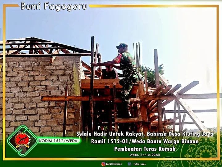 Halmahera Tengah-Babinsa Koptu Ibrahim Tuankotta melaksanakan giat Karbak, membantu pembuatan rangka teras rumah milik Bapak Wahyudin Ibrahim, bertempat di Desa Kluting Jaya Kecamatan Weda Selatan Kabupaten Halmahera Tengah. Selasa, (14/10/2025)