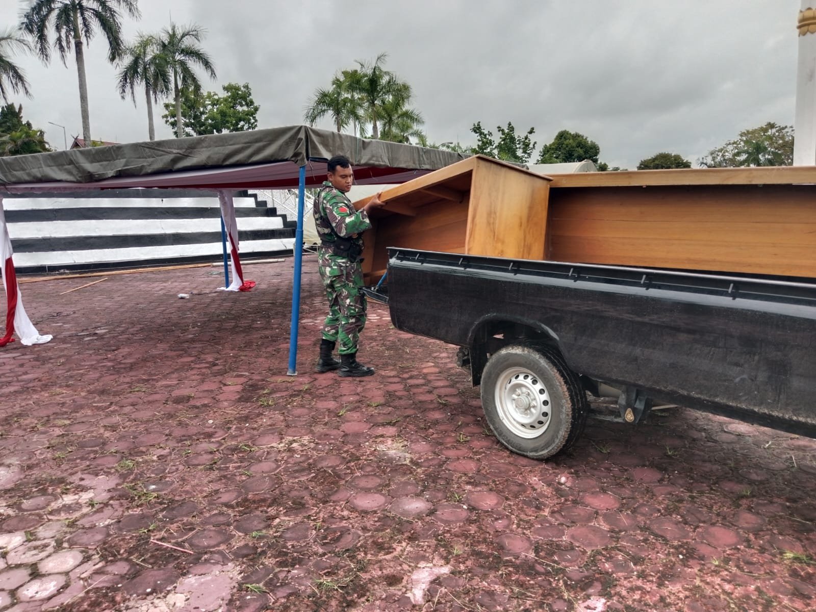 Meski pekerjaan sudah rampung, suasana di lokasi TMMD tetap dipenuhi kesibukan. Anggota Satgas bersama warga tampak bergotong royong menata lingkungan, membersihkan area, serta mempersiapkan tempat pelaksanaan upacara penutupan.