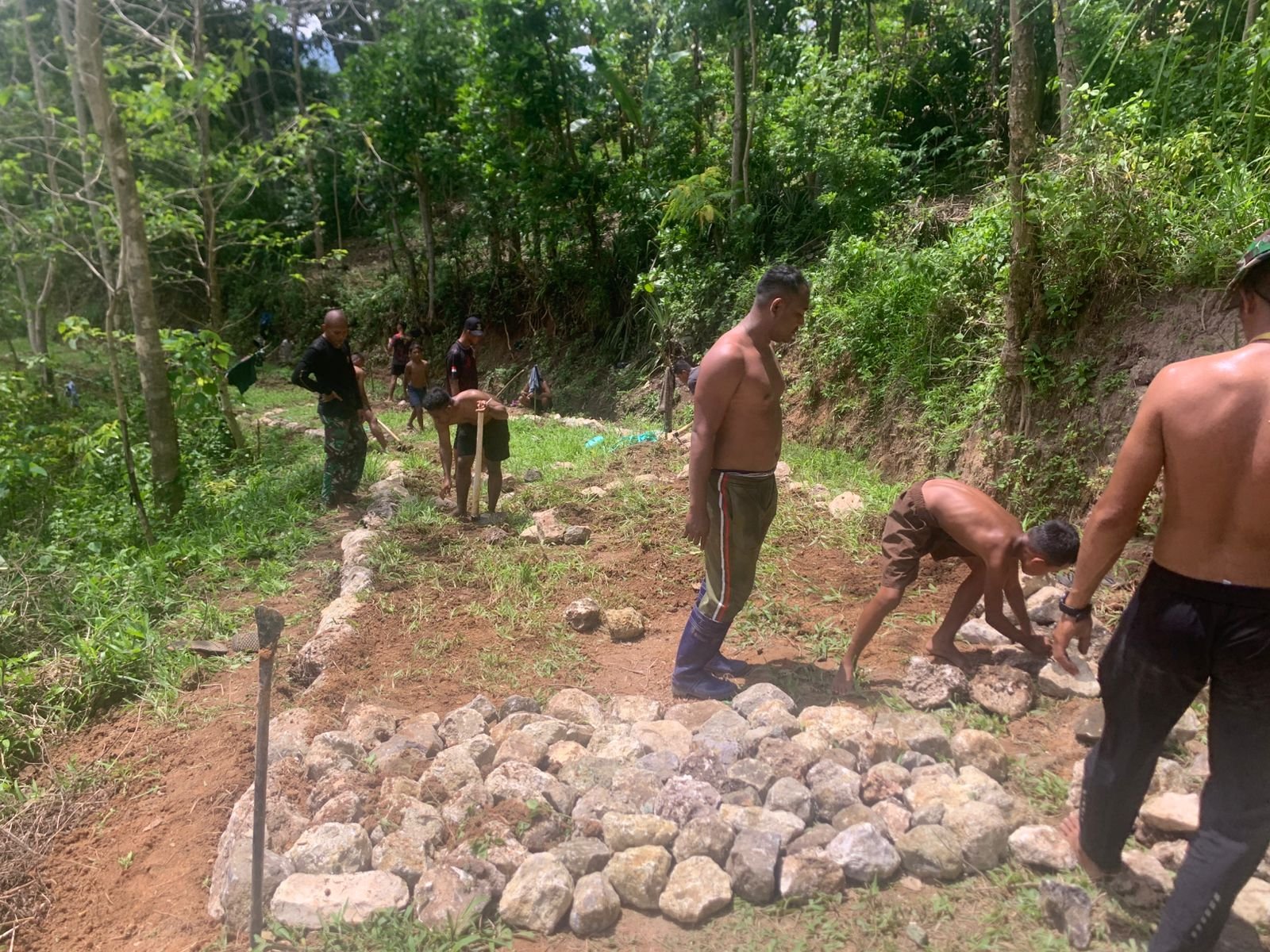 Kegiatan yang dilakukan pada Minggu (12/10/2025) ini menjadi bukti nyata kemanunggalan TNI dengan rakyat. Medan terjal dan berbukit di wilayah tersebut tak menyurutkan langkah para prajurit dan warga untuk bergandengan tangan memperlancar proses pembangunan.