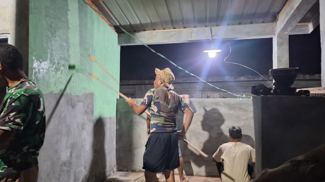 Sebanyak lima orang anggota Satgas bersama dua warga bahu-membahu mengerjakan berbagai tahapan pembangunan, mulai dari plamir dan pengecatan dinding hingga pemasangan lisplang atap. Meski dilakukan di malam hari, semangat gotong royong tetap membara.