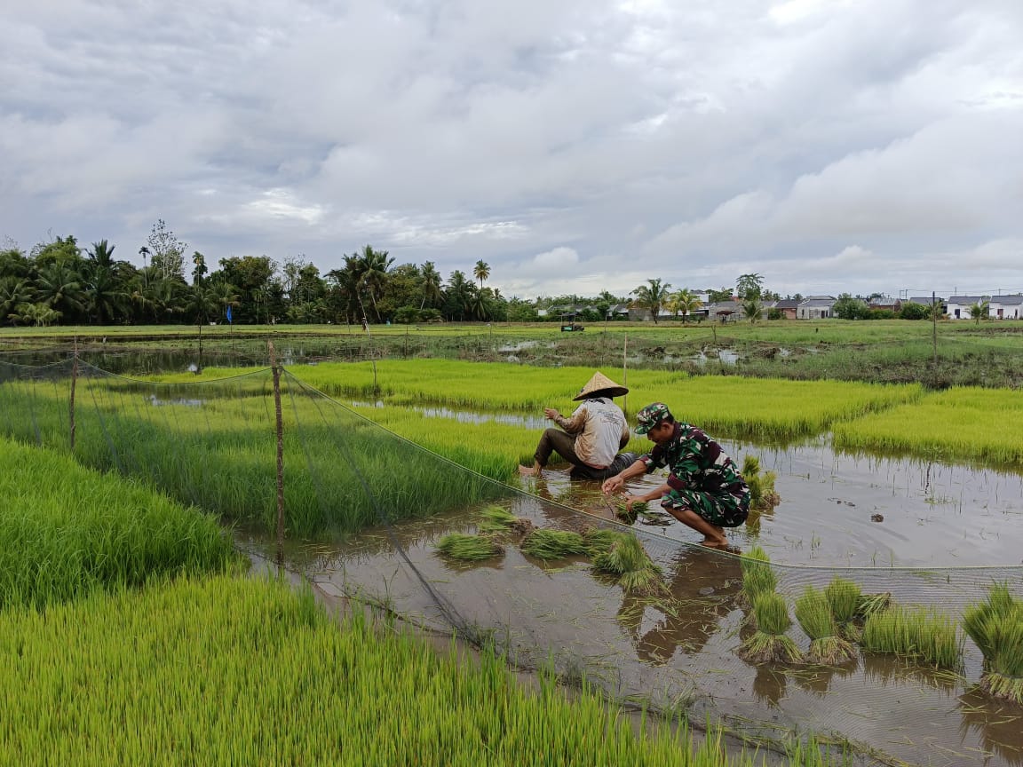 Aceh Barat – Babinsa Koramil 04/Mrb Kodim 0105/Abar Sertu Sugeng Ariono dengan penuh semangat melakukan aksi pendampingan Ketahanan Pangan secara turun langsung ke Sawah guna membantu proses pencabutan bibit atau benih Padi yang siap tanam milik salah satu Petani yang berlokasi di Desa Langung Kecamatan Meureubo, Kamis (12/6/2025)