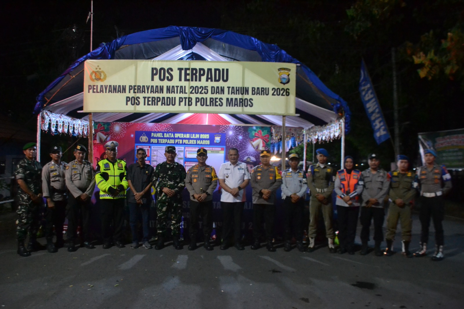 Maros – Dalam upaya menjaga keamanan selama perayaan Natal dan Tahun Baru 2025, Komandan Kodim 1422/Maros, Letkol Inf. Zulkarnain, bersama Forum Koordinasi Pimpinan Daerah (Forkopimda) Kabupaten Maros, melaksanakan peninjauan ke sejumlah Pos Pengamanan (Pos Pam) pada Selasa malam (24/12). Kegiatan ini bertujuan untuk memastikan kesiapan pengamanan dan pelayanan kepada masyarakat, terutama bagi umat Kristiani yang akan merayakan ibadah Natal.