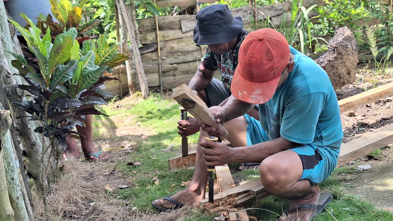 Di bawah sinar matahari yang menyengat, suara alat pertukangan bersatu dengan semangat kebersamaan. Para prajurit dan warga dengan keterampilan mereka memotong kayu dengan teliti, memastikan bahwa rangka rumah terpasang dengan kuat dan akurat.
