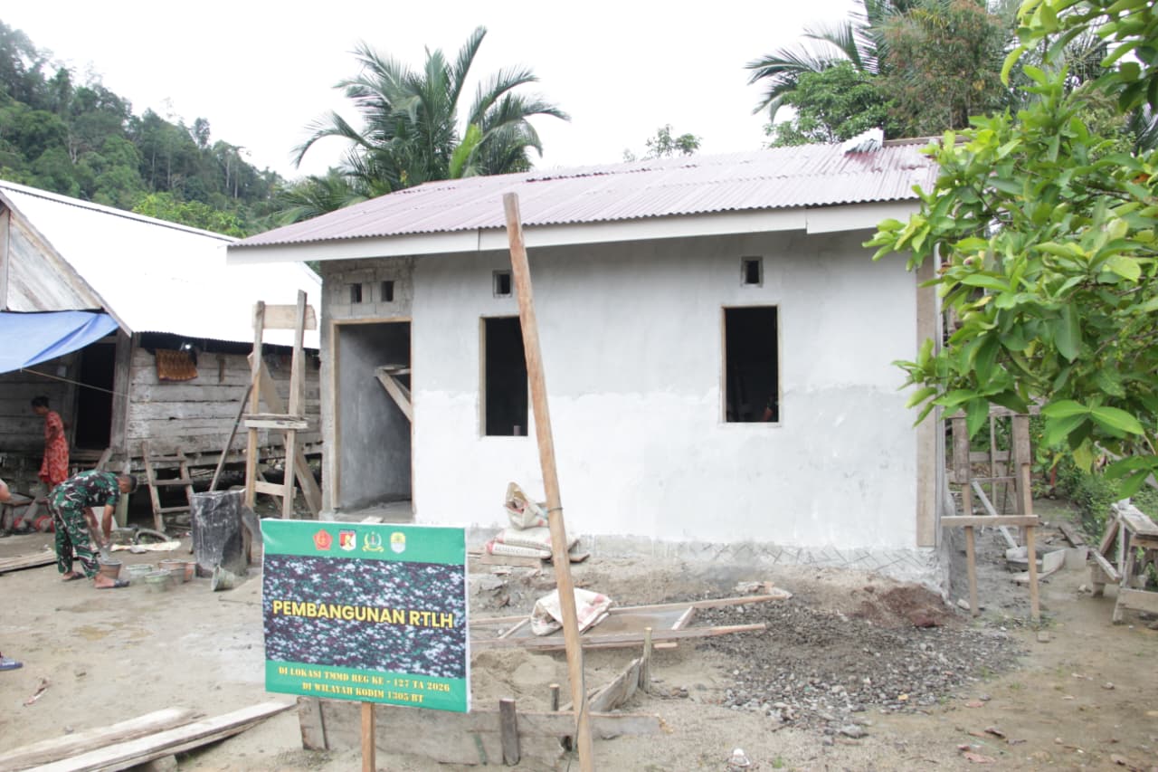 Tolitoli – Proses pembangunan Rumah Tinggal Layak Huni (RTLH) dalam program TNI Manunggal Membangun Desa (TMMD) ke-127 terus berlangsung di Dusun Ogomolobu, Desa Oyom, Kecamatan Lampasio, Kabupaten Tolitoli, pada hari Sabtu (21/2/2026). Tim Satgas TMMD dari Kodim 1305/Buol Tolitoli bekerja sama dengan masyarakat setempat menunjukkan kebersamaan yang kuat dalam melaksanakan berbagai tahapan pembangunan, mulai dari penyusunan bata, pengecoran lantai, hingga pemasangan rangka atap.