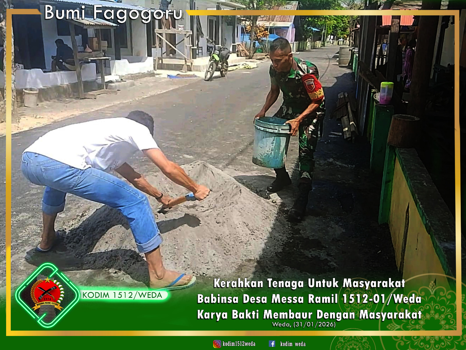 Halmahera Tengah – Pada Sabtu, 31 Januari 2026, Babinsa Kopda Idrus Wally dari Ramil 1512-01/Weda menggelar kegiatan karya bakti di Desa Messa, Kecamatan Weda Timur, Kabupaten Halmahera Tengah. Dalam kegiatan ini, ia bersama warga setempat berkolaborasi untuk membantu pembangunan rumah milik Bapak Dulla, salah satu anggota masyarakat yang membutuhkan bantuan.