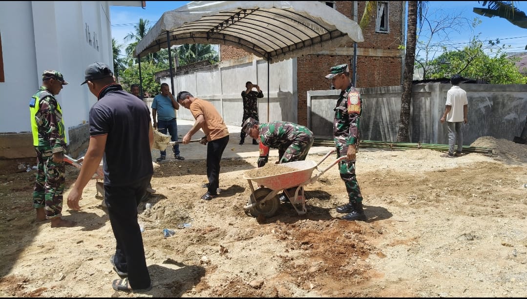 Nagan Raya – Anggota Posramil Tadu Raya Kodim 0116/Nara bersama warga melaksanakan gotong royong meratakan pasir di kompleks Masjid Baitul Taqwa, Desa Gunung Pungkie (Alue Gani), Kecamatan Tadu Raya, Kabupaten Nagan Raya, Rabu (24/9/2025).