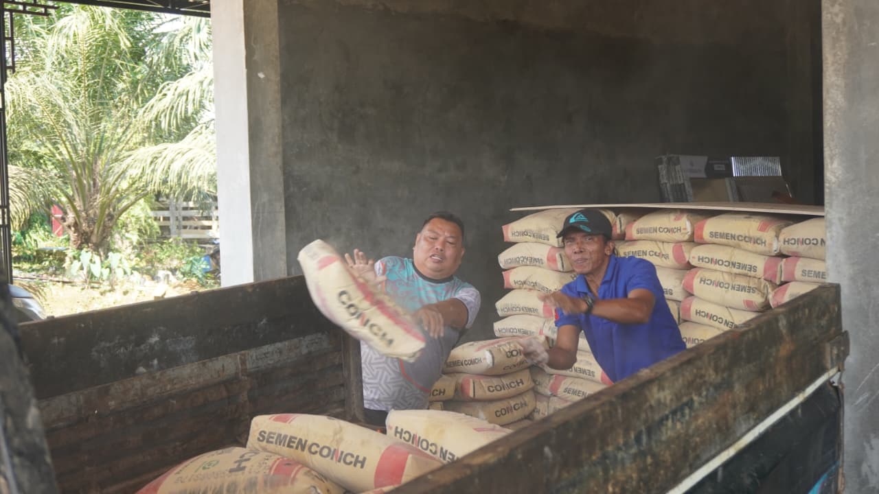 Proses pengiriman semen dilakukan dengan menggunakan kendaraan pickup yang langsung menuju lokasi proyek. Setibanya di lokasi, anggota Satgas dan warga saling bahu-membahu untuk menurunkan dan menyusun material agar siap untuk digunakan dalam proses pembangunan.