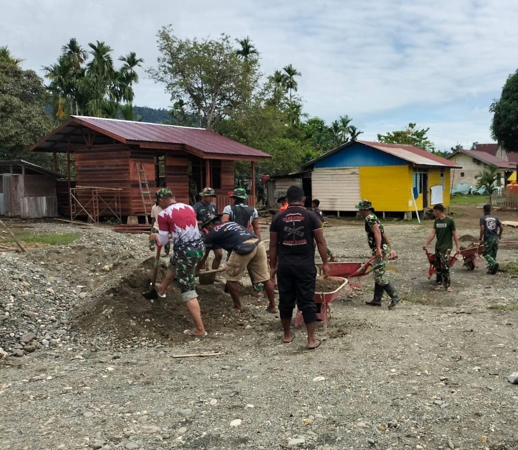Prajurit TNI juga memberikan arahan teknis dan bekerja sama penuh semangat. Interaksi antara warga dan Satgas pun terlihat begitu akrab, mencerminkan kemanunggalan yang nyata.