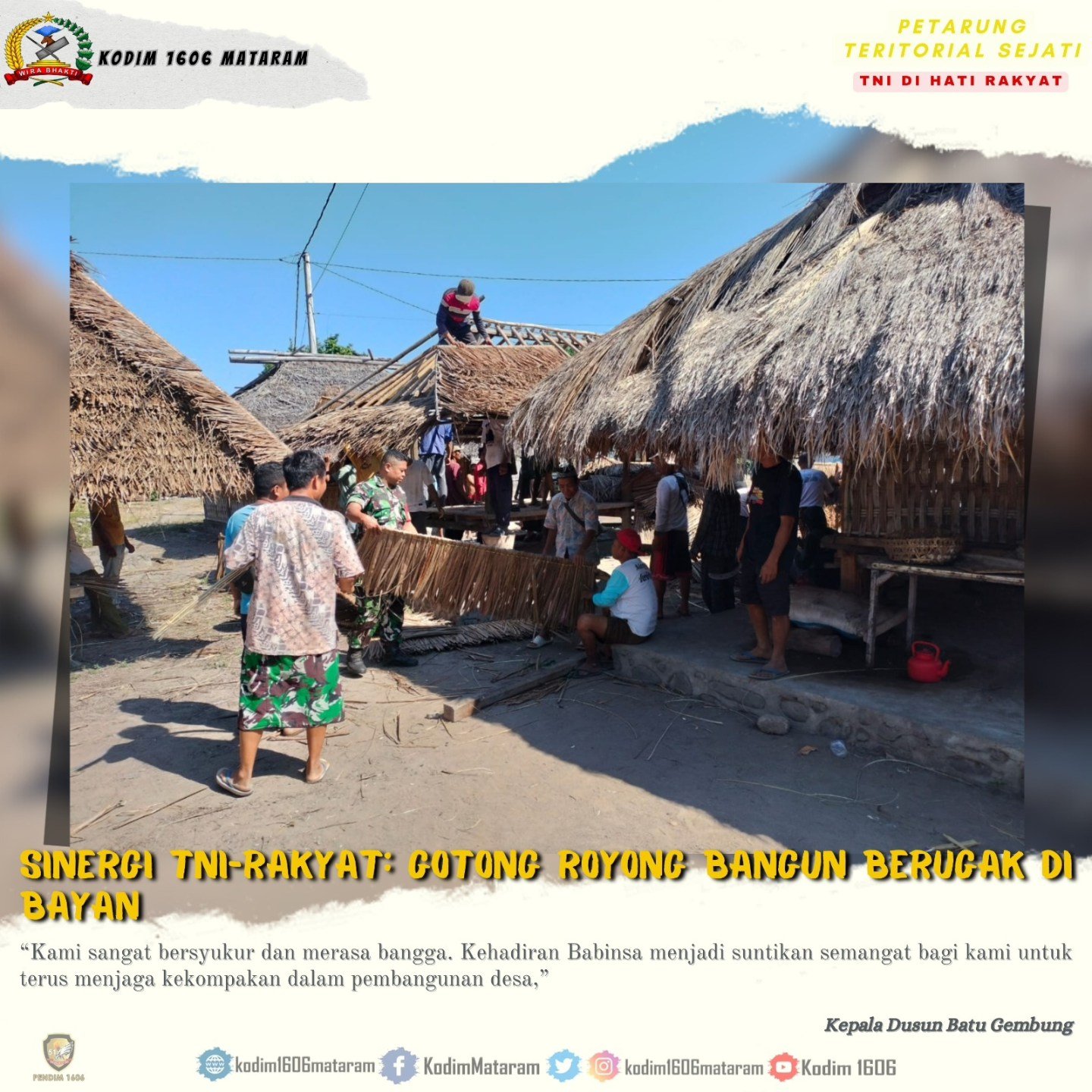 “Sebagai Babinsa, saya merasa punya tanggung jawab moral dan sosial untuk selalu hadir di tengah masyarakat. Gotong royong ini bukan semata membangun berugak, tetapi juga membangun semangat kebersamaan dan kekuatan sosial,” ungkap Pelda Wahyu.