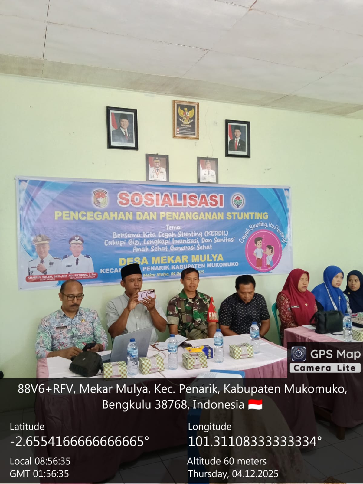 Pada Kamis, 4 Desember 2025, Kodim 0428/MukoMuko berpartisipasi dalam kegiatan sosialisasi stunting yang berlangsung di Desa Mekar Mulya, Kecamatan Penarik, Kabupaten MukoMuko. Kegiatan ini bertujuan untuk mempercepat penurunan angka stunting di wilayah tersebut, dengan melibatkan berbagai pihak terkait.