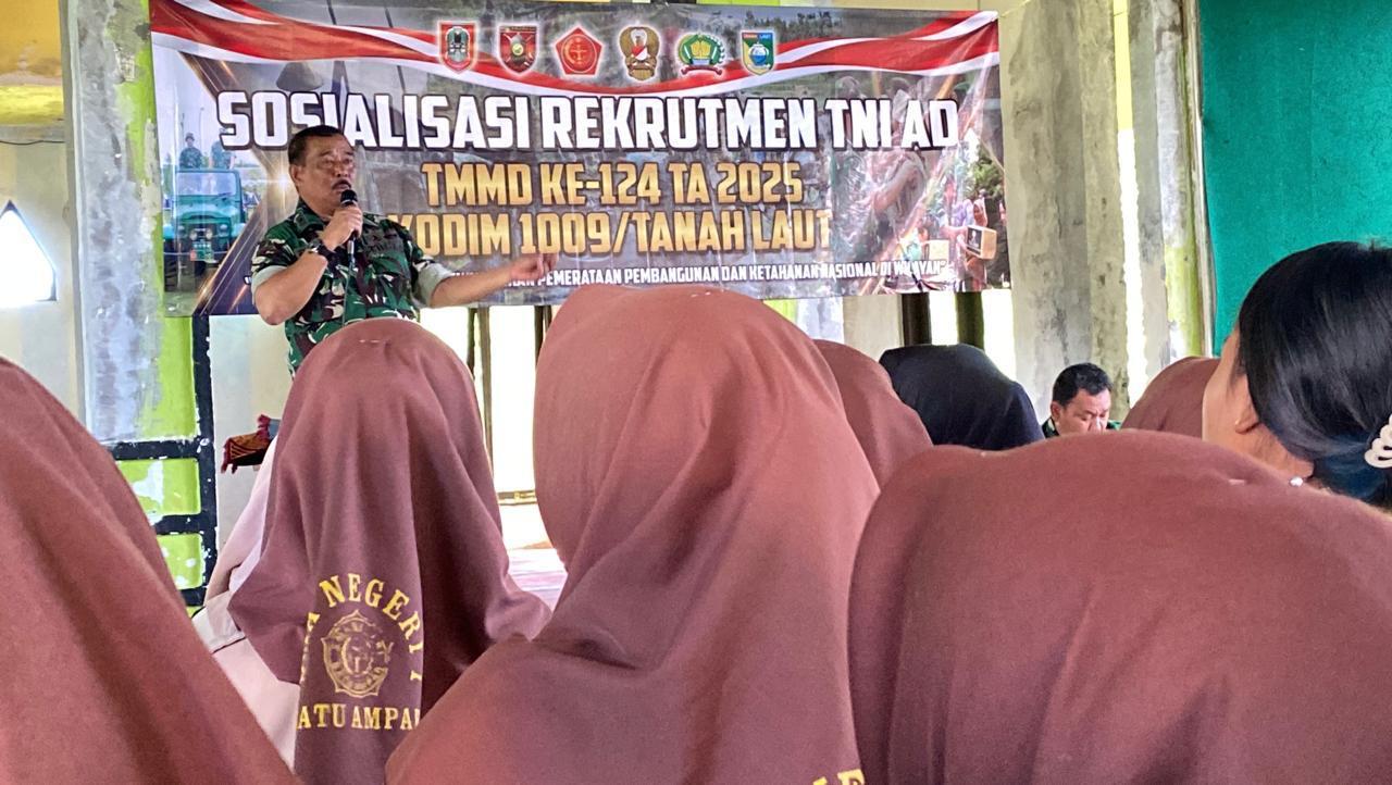 “Untuk saat ini TNI tengah melaksanakan rekrutmen prajurit meliputi Perwira, Bintara, dan Tamtama. Untuk pendaftaran bisa melalui online dengan pendaftaran di situs web khusus atau juga bisa datang langsung dan bertanya pada Babinsa yang ada di wilayah masing-masing maupun langsung mendatangi ke Kodim 1009/Tanah Laut. Untuk adik-adik yang sekarang masih duduk di bangku kelas X dan XI masih ada waktu satu tahun untuk mempersiapkan diri,” ungkapnya.